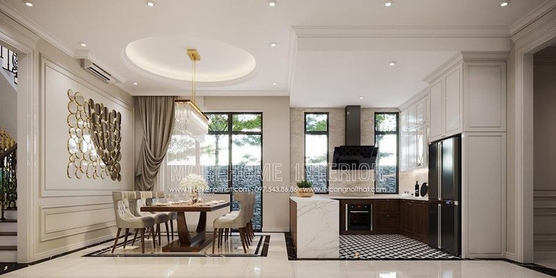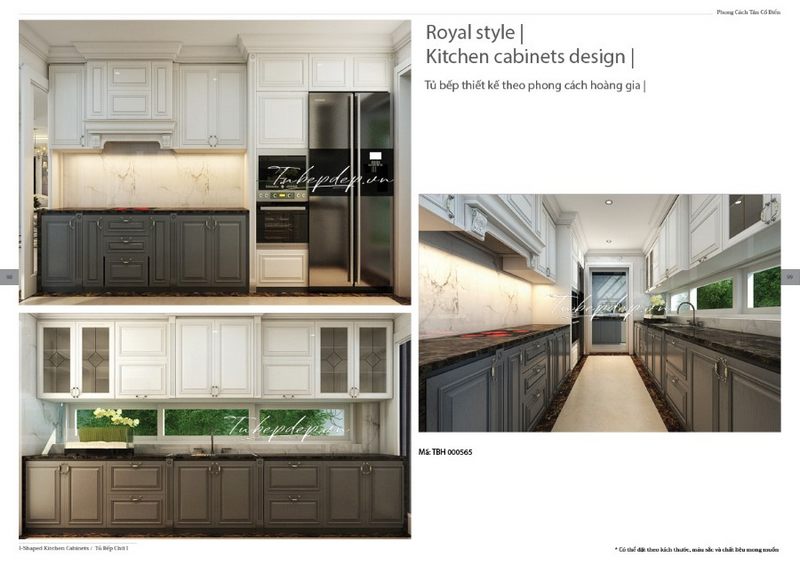 Mẫu tủ bếp thiết kế phong cách tân cổ điển hoàng gia phân chia rõ trên dưới 2 sắc màu đối lập dành cho không gian của biệt thự, nhà phố