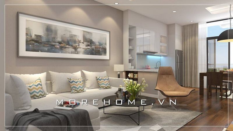 Căn hộ chung cư có diện tích nhỏ nhưng vẫn sang trọng và tiện nghi, thoáng đãng. Nội thất bao gồm sofa hiện đại, dáng văng gọn gàng với chất liệu gỗ óc chó cao cấp.